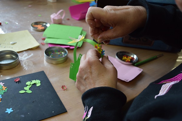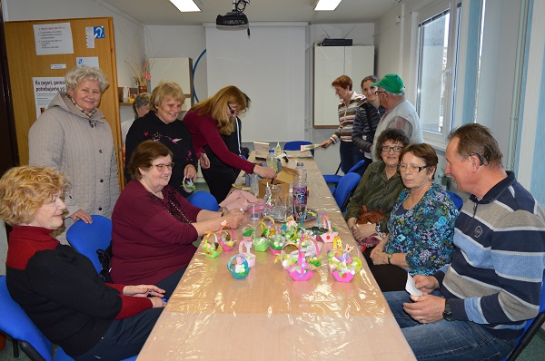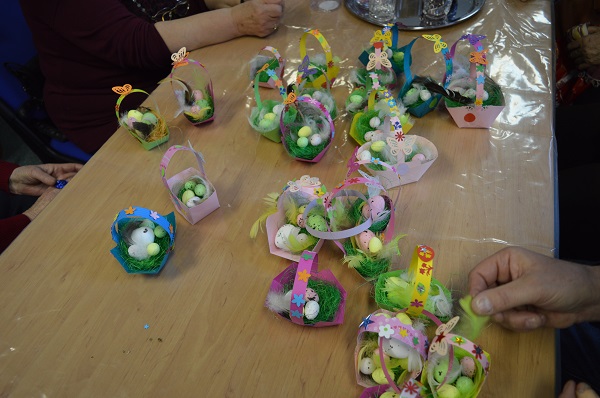 V mesecu aprilu je Velika noč, zato je vodstvo povabilo članice in člane na delavnico. Udeležba je bila številčna. Mentorica Marina je pripravila na mizo polno materiala za izdelavo velikonočnih košaric. Tako smo lahko začeli z delom. Tudi predsednik Franc nas je prišel pogledati, kako nam teče delo.